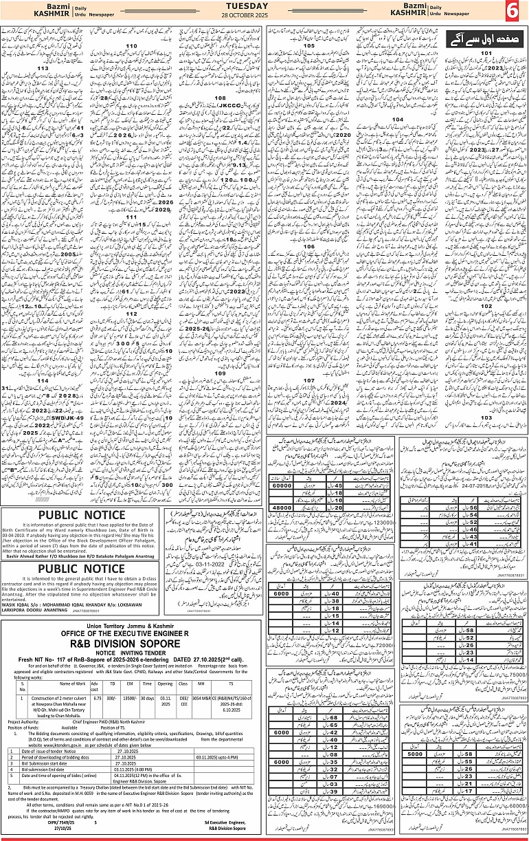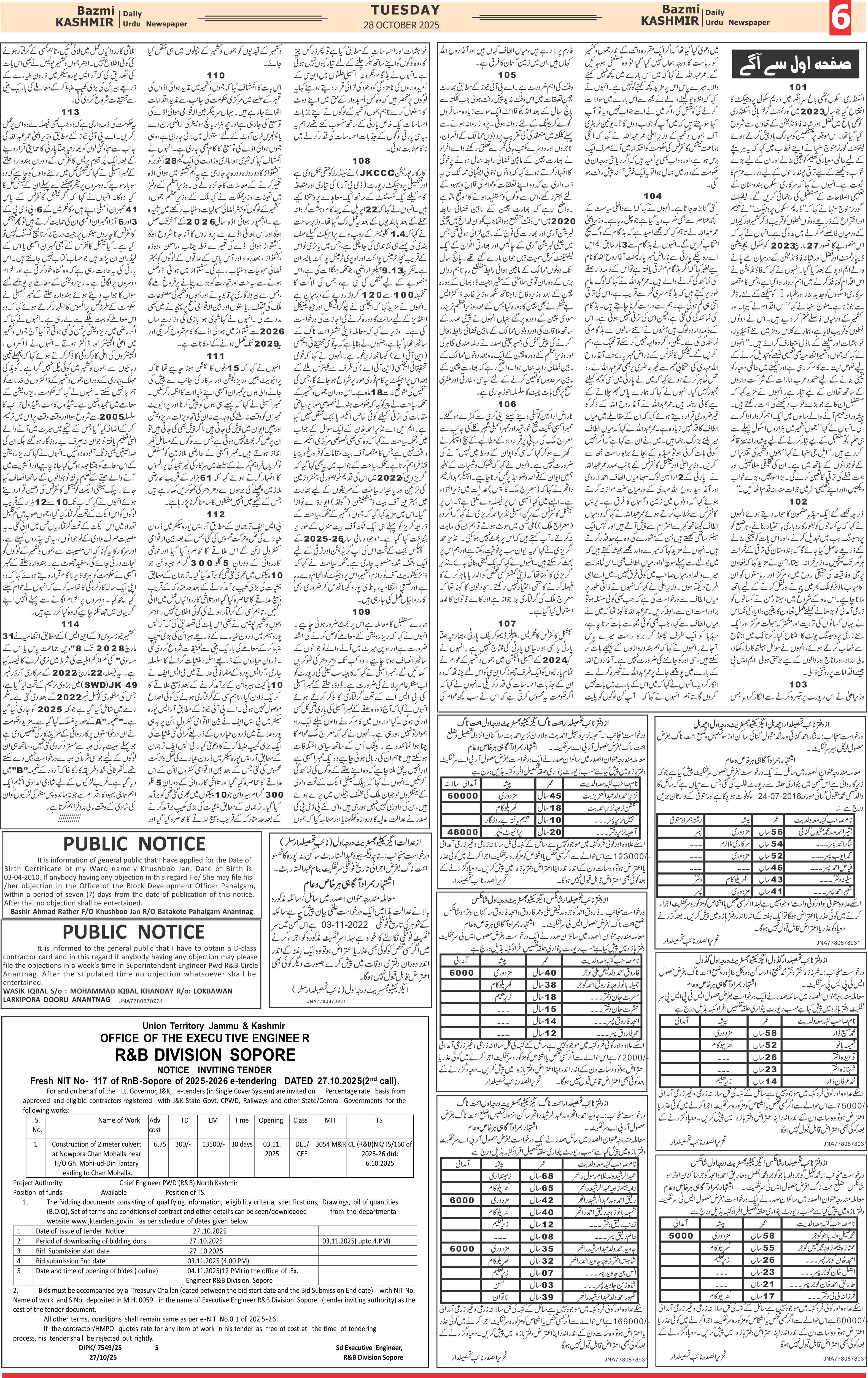 Bazam Kashmir Page: 6 October 28, 2025 << First << 6 >> Last >> Page 1Page 2Page 3Page 4Page 5Page 6Page 7Page 8 × Bazam Kashmir B -6 B -1B -2B -3B -4B -5B -6B -7B -8