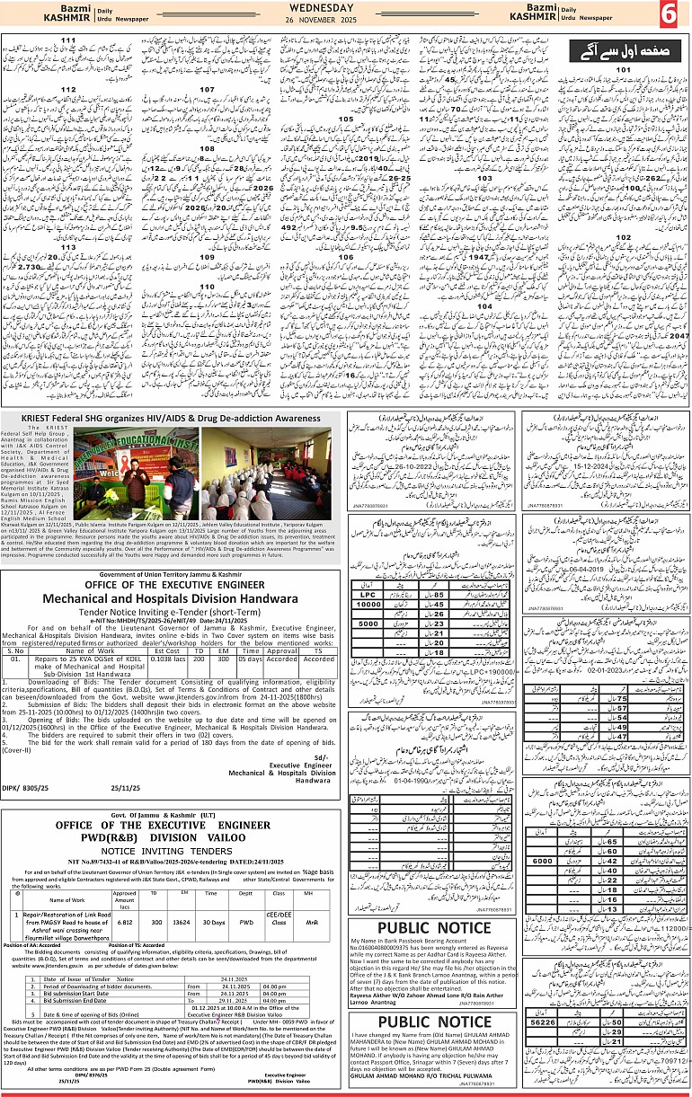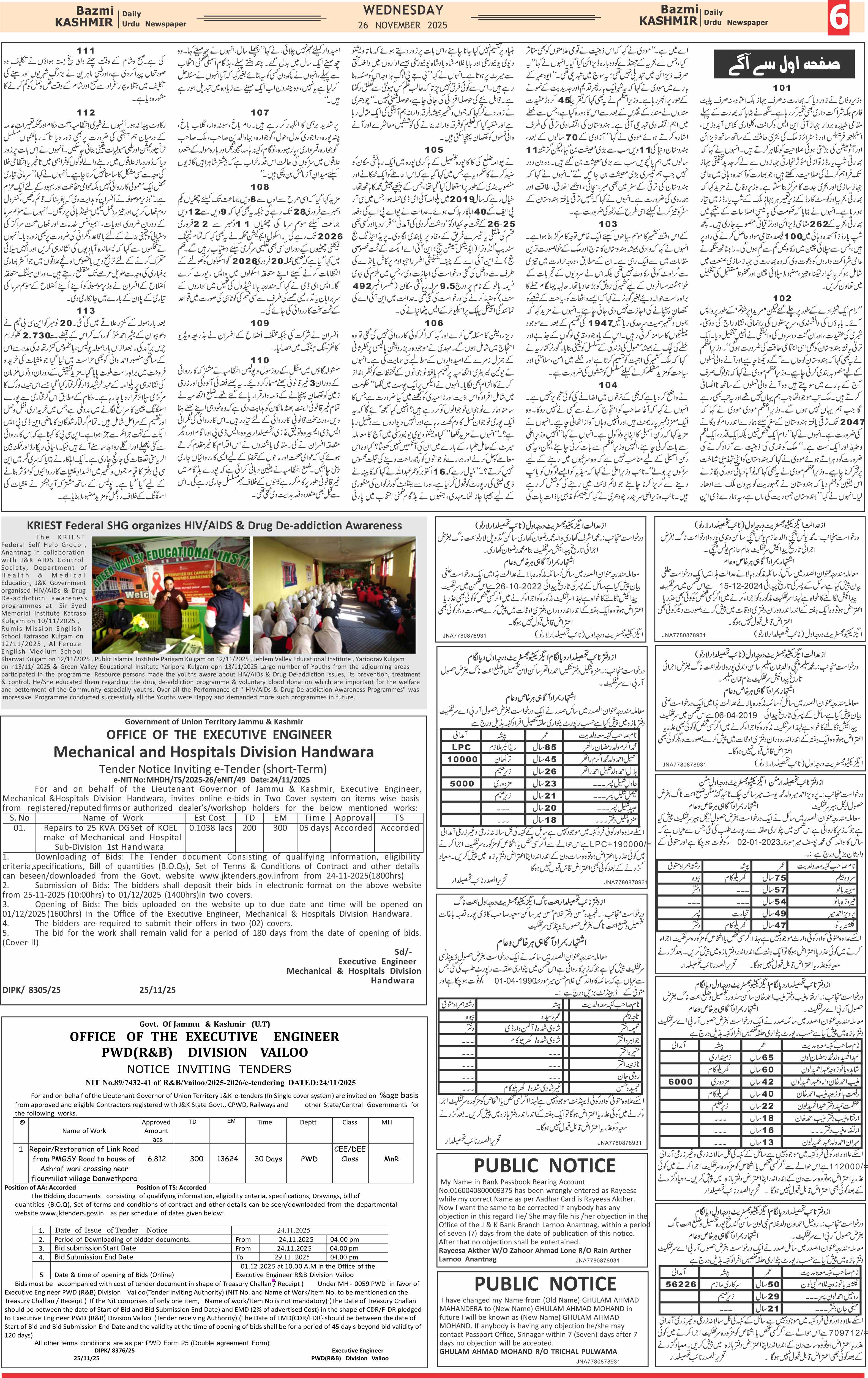 Bazam Kashmir Page: 6 November 26, 2025 << First << 6 >> Last >> Page 1Page 2Page 3Page 4Page 5Page 6Page 7Page 8 × Bazam Kashmir B -6 B -1B -2B -3B -4B -5B -6B -7B -8