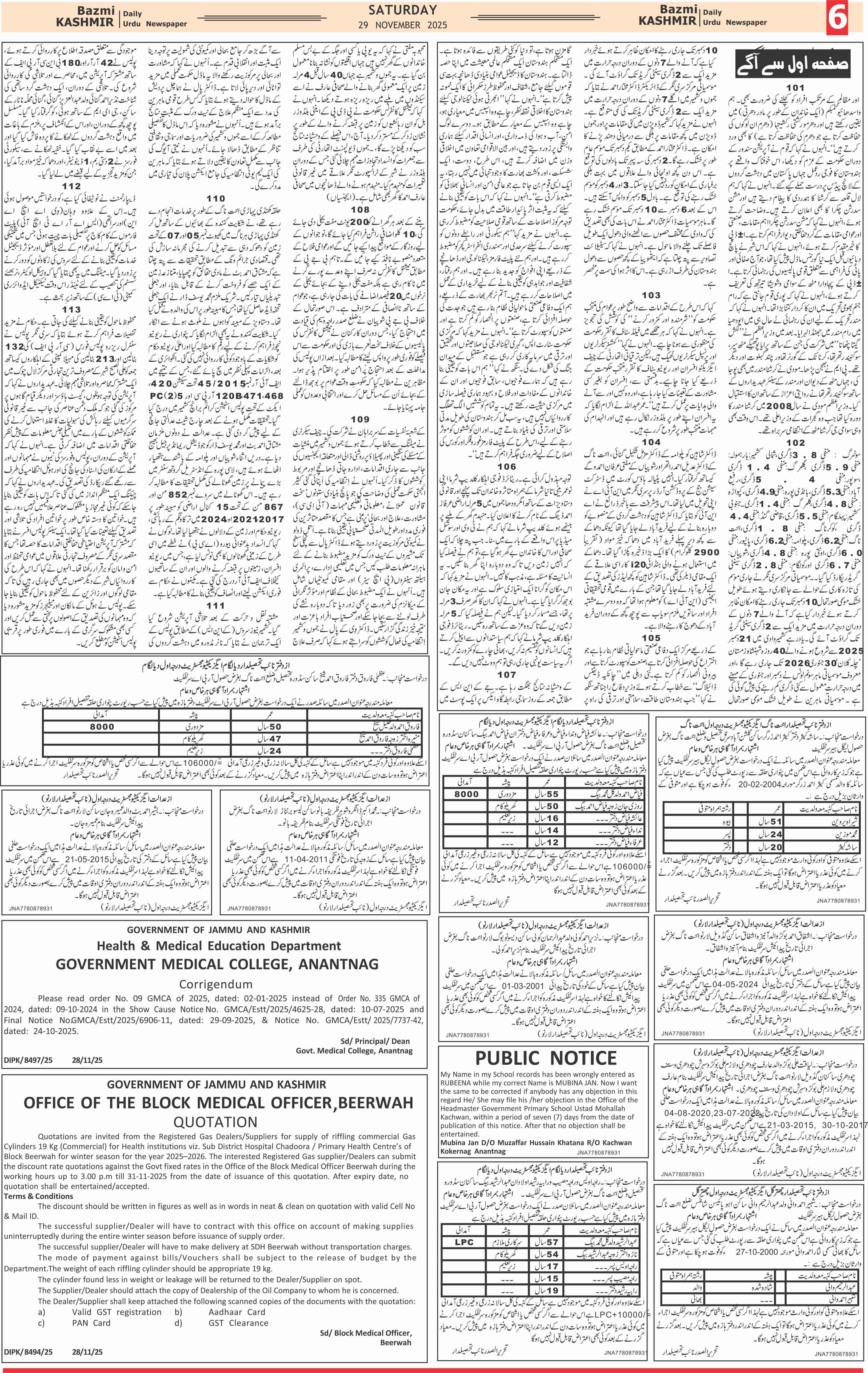 Bazam Kashmir Page: 6 November 29, 2025 << First << 6 >> Last >> Page 1Page 2Page 3Page 4Page 5Page 6Page 7Page 8 × Bazam Kashmir B -6 B -1B -2B -3B -4B -5B -6B -7B -8