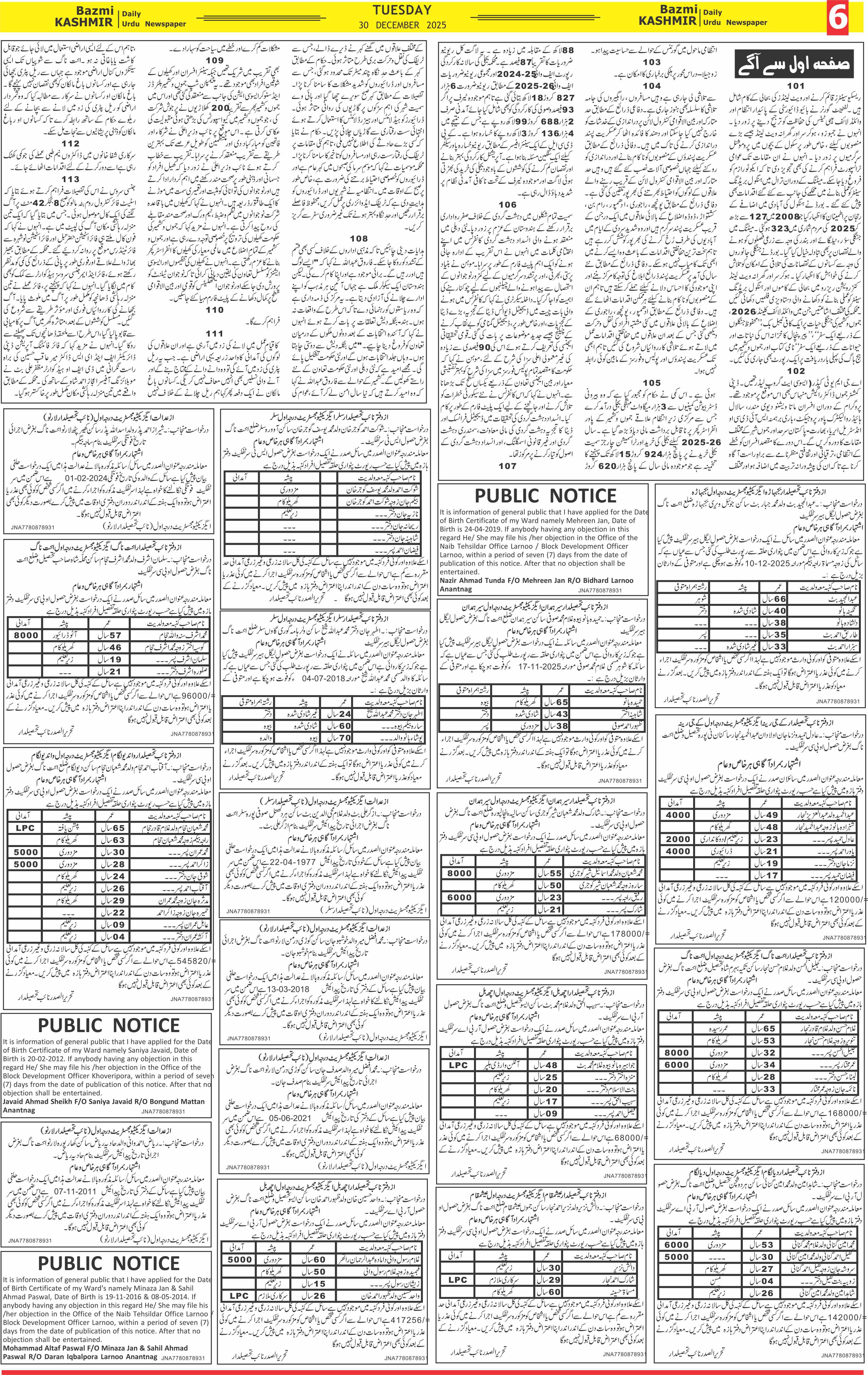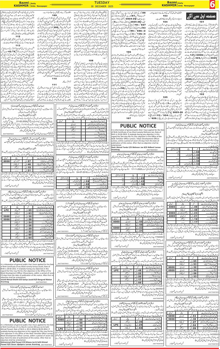 Bazam Kashmir Page: 6 December 30, 2025 << First << 6 >> Last >> Page 1Page 2Page 3Page 4Page 5Page 6Page 7Page 8 × Bazam Kashmir B -6 B -1B -2B -3B -4B -5B -6B -7B -8