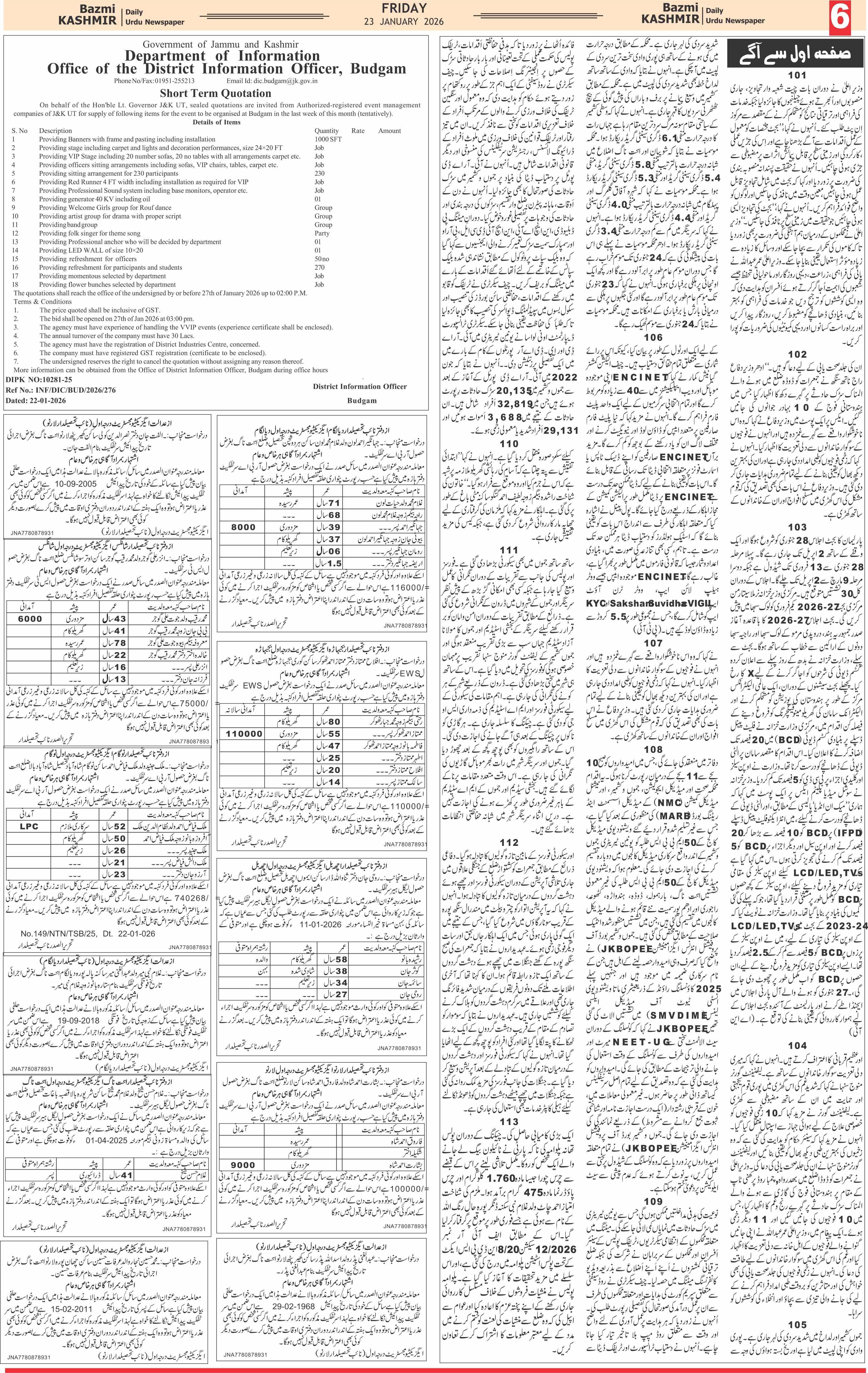 Bazam Kashmir Page: 6 January 23, 2026 << First << 6 >> Last >> Page 1Page 2Page 3Page 4Page 5Page 6Page 7Page 8 × Bazam Kashmir B -6 B -1B -2B -3B -4B -5B -6B -7B -8