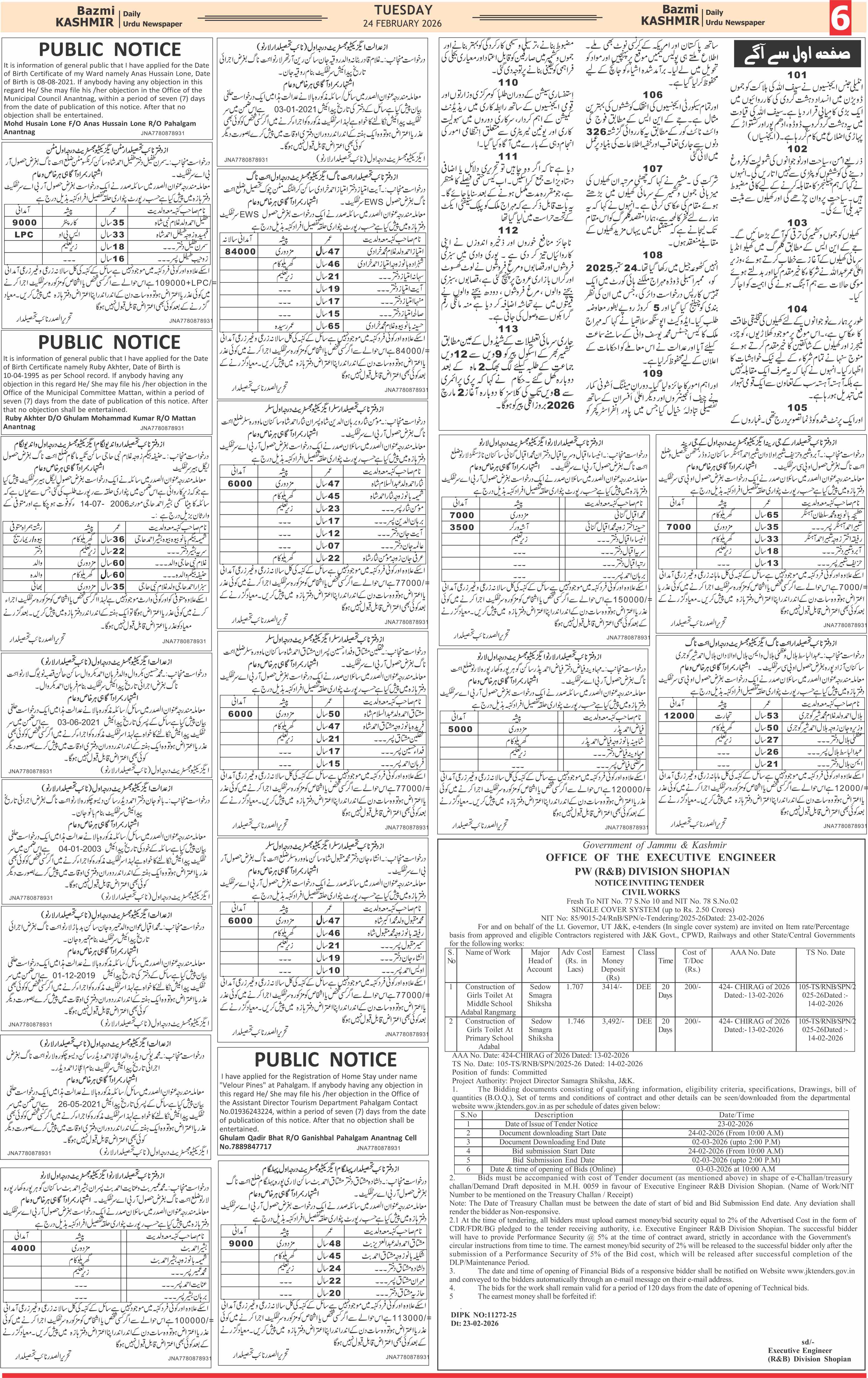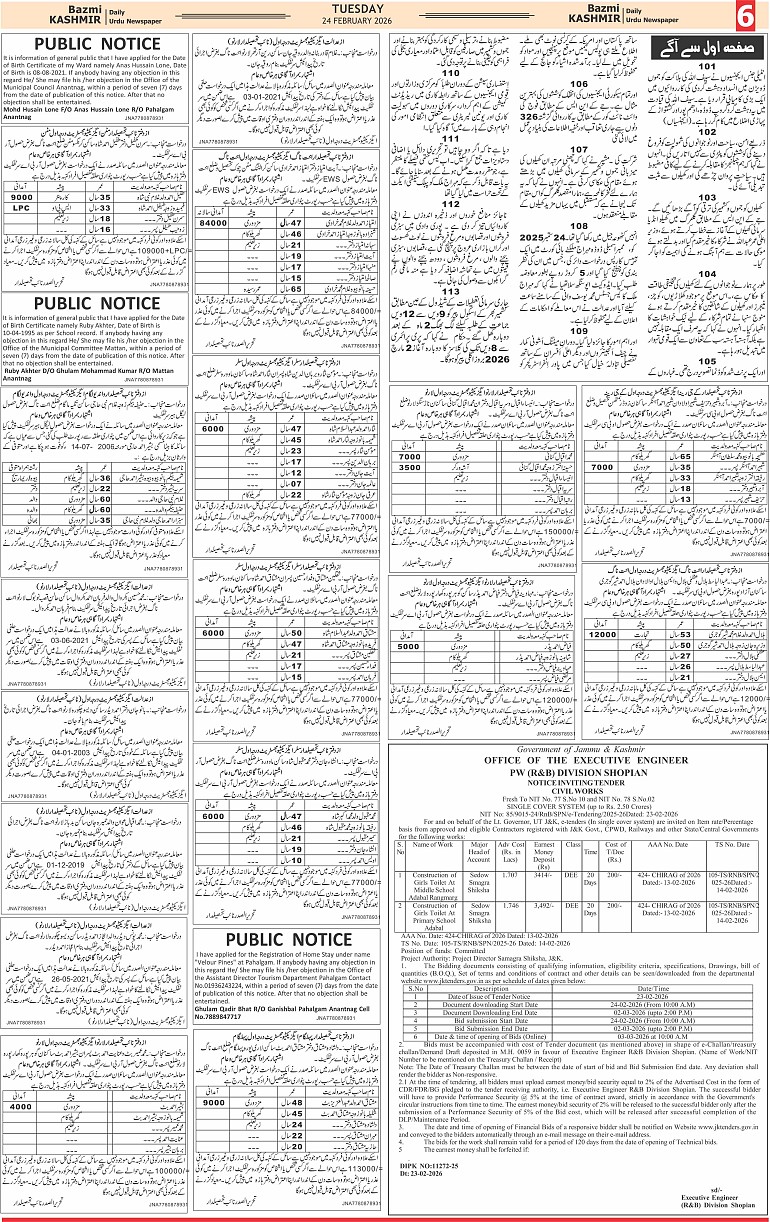 Bazam Kashmir Page: 6 February 24, 2026 << First << 6 >> Last >> Page 1Page 2Page 3Page 4Page 5Page 6Page 7Page 8 × Bazam Kashmir B -6 B -1B -2B -3B -4B -5B -6B -7B -8