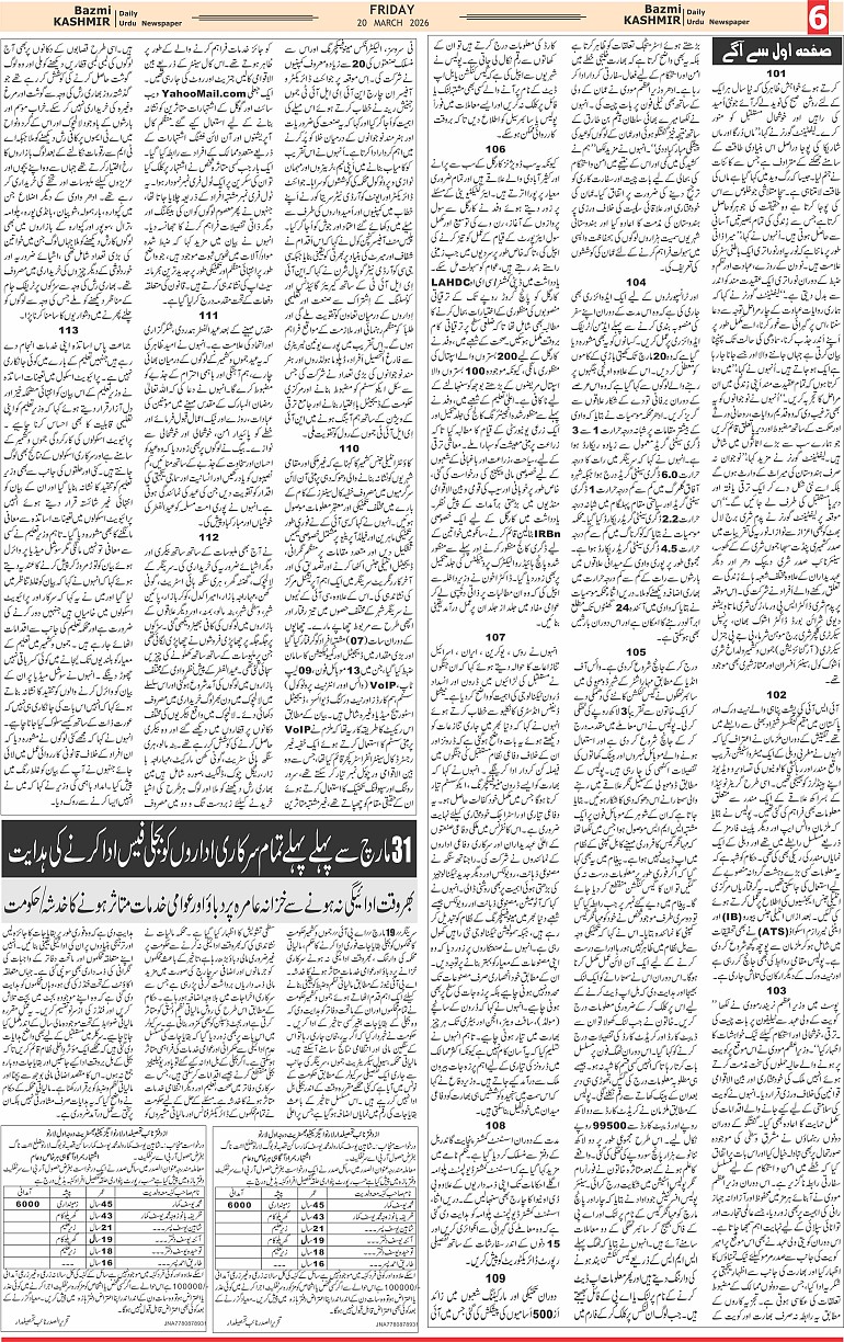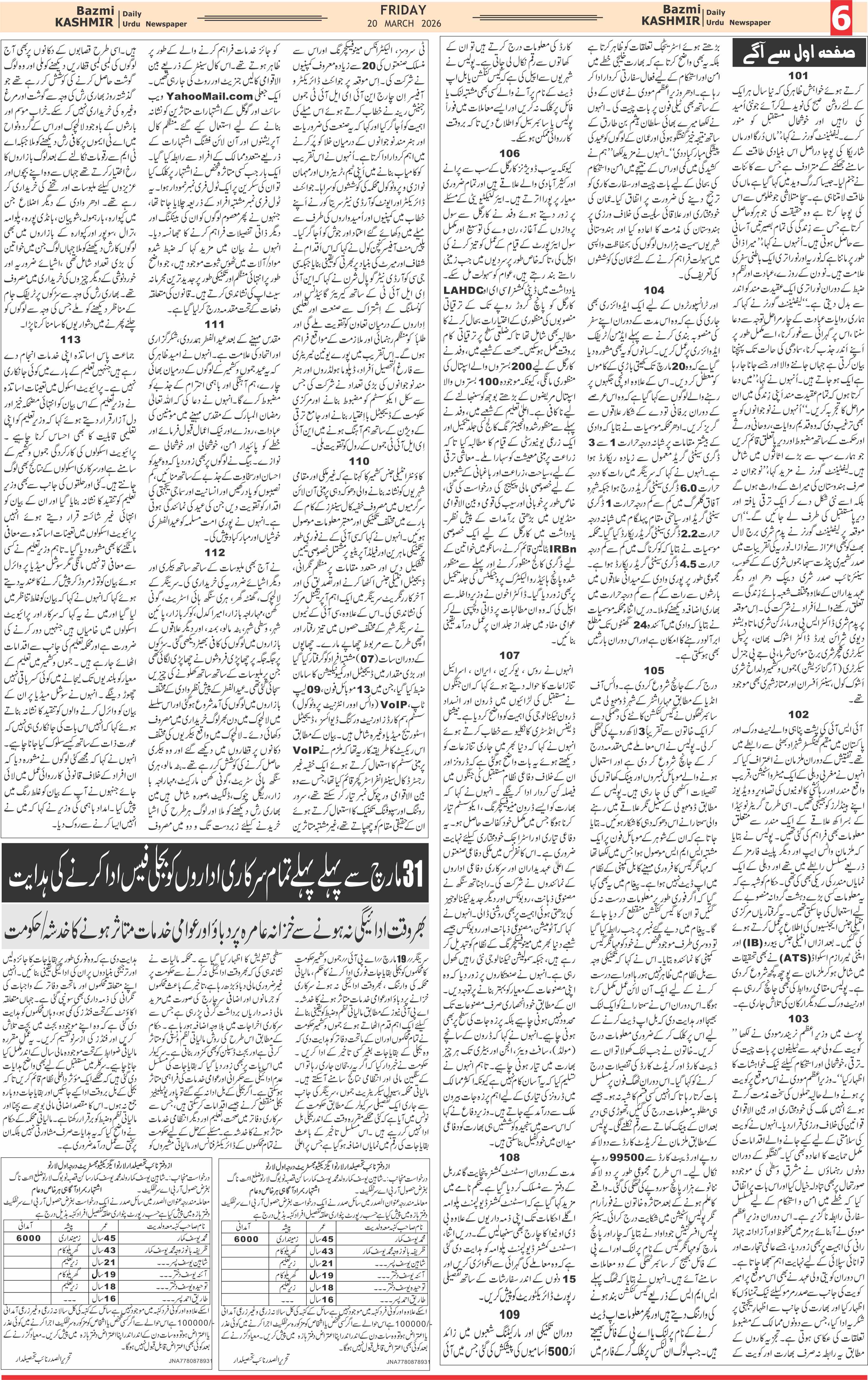 Bazam Kashmir Page: 6 March 20, 2026 << First << 6 >> Last >> Page 1Page 2Page 3Page 4Page 5Page 6Page 7Page 8 × Bazam Kashmir B -6 B -1B -2B -3B -4B -5B -6B -7B -8