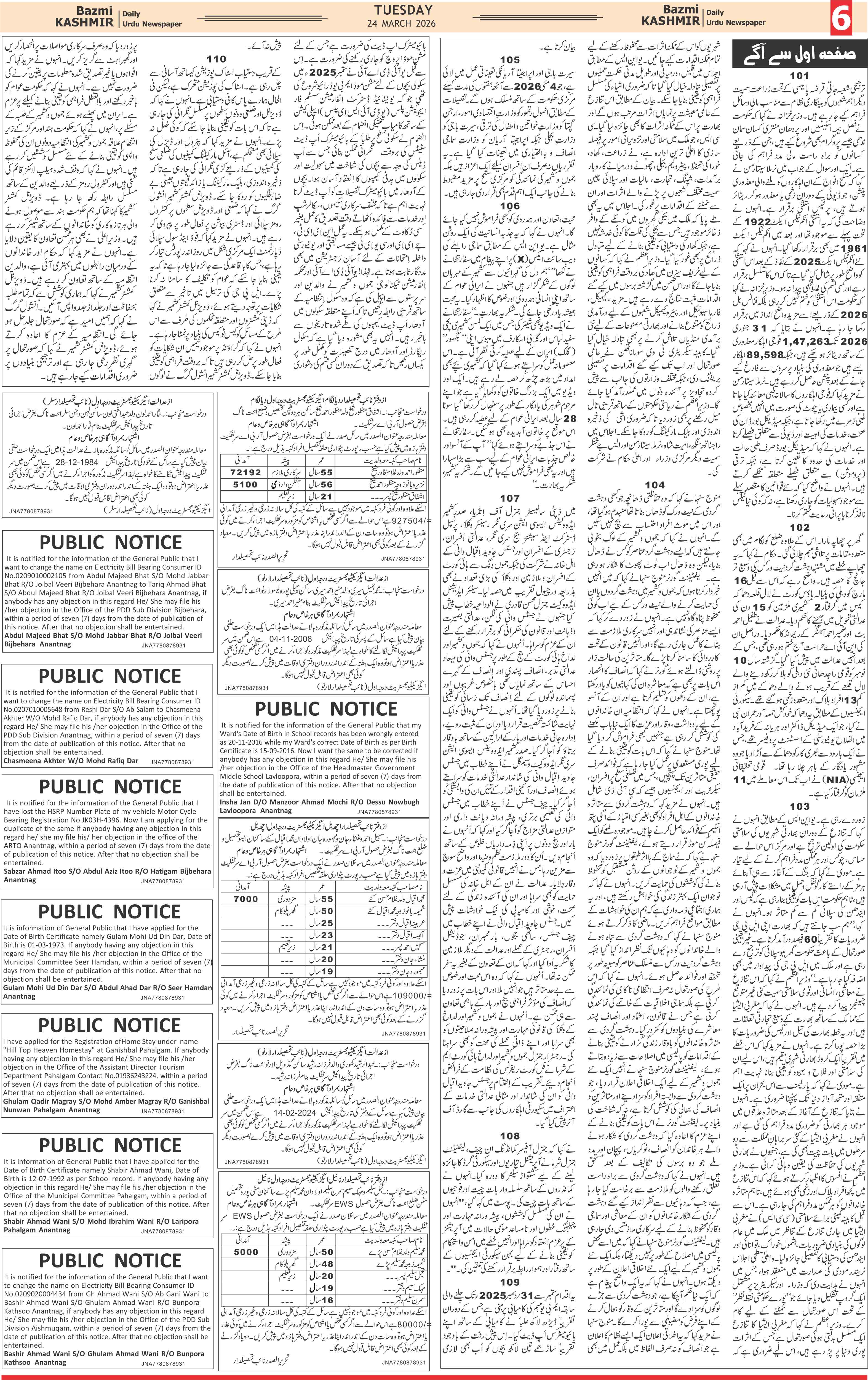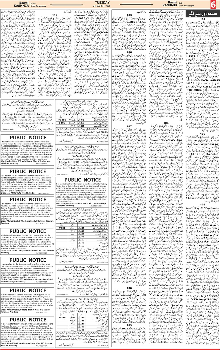 Bazam Kashmir Page: 6 March 24, 2026 << First << 6 >> Last >> Page 1Page 2Page 3Page 4Page 5Page 6Page 7Page 8 × Bazam Kashmir B -6 B -1B -2B -3B -4B -5B -6B -7B -8