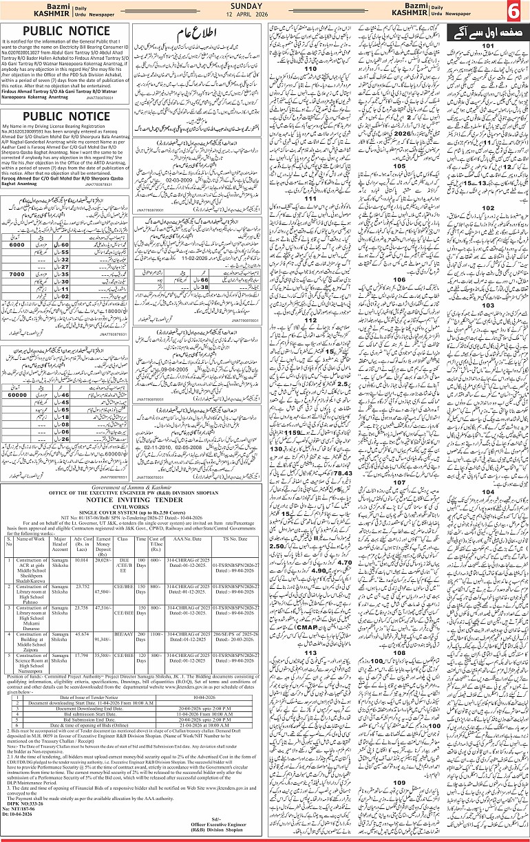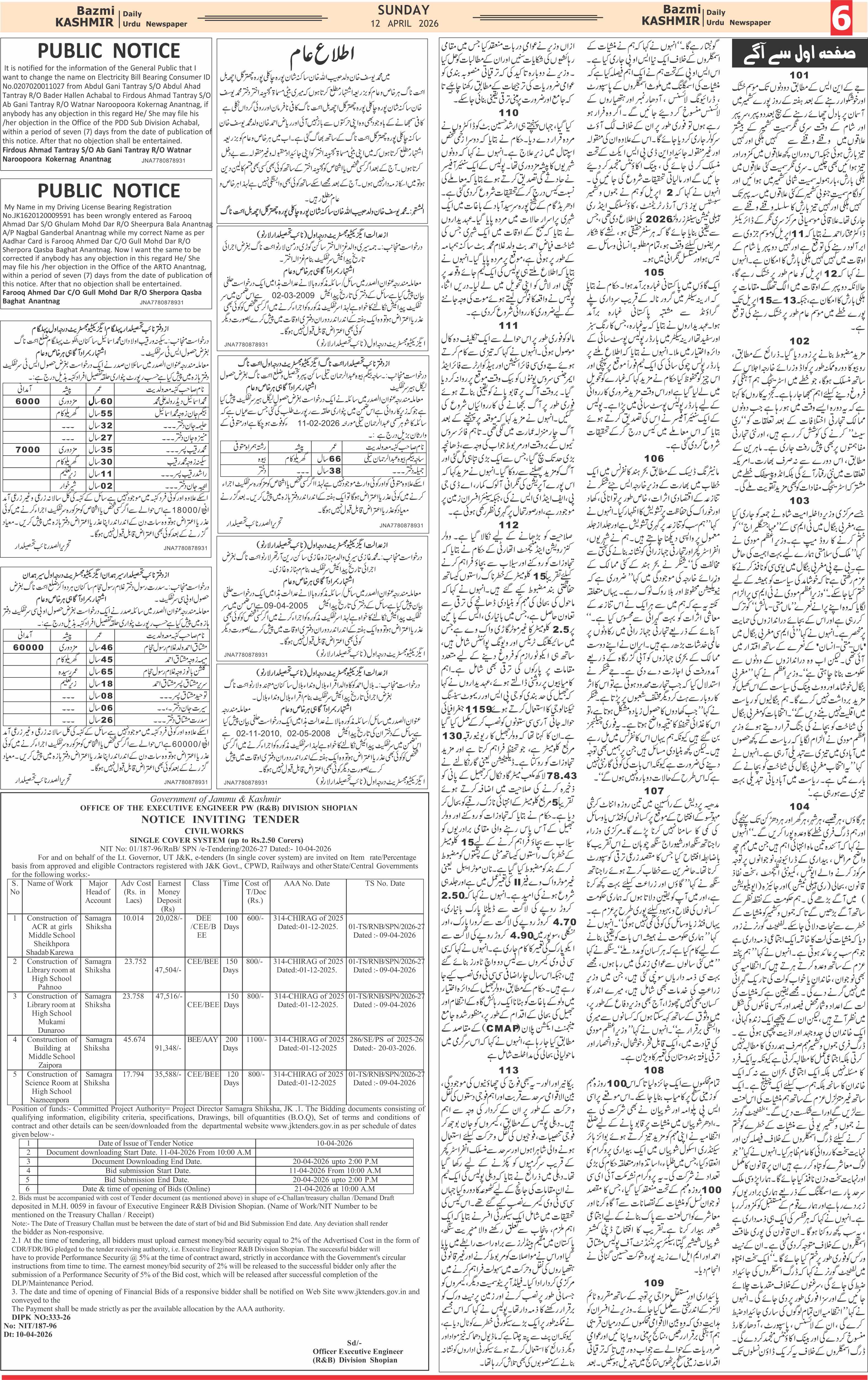 Bazam Kashmir Page: 6 April 12, 2026 << First << 6 >> Last >> Page 1Page 2Page 3Page 4Page 5Page 6Page 7Page 8 × Bazam Kashmir B -6 B -1B -2B -3B -4B -5B -6B -7B -8