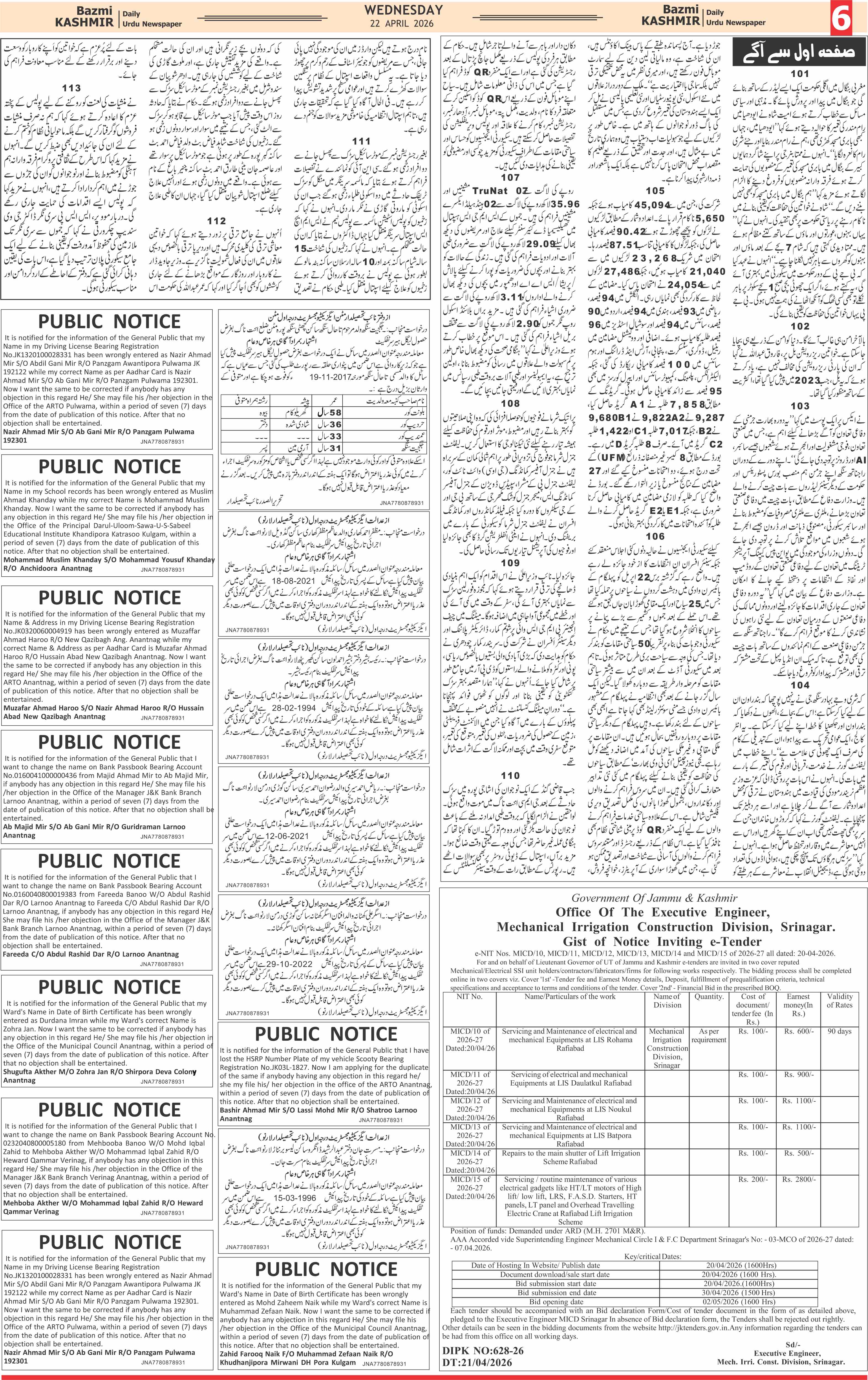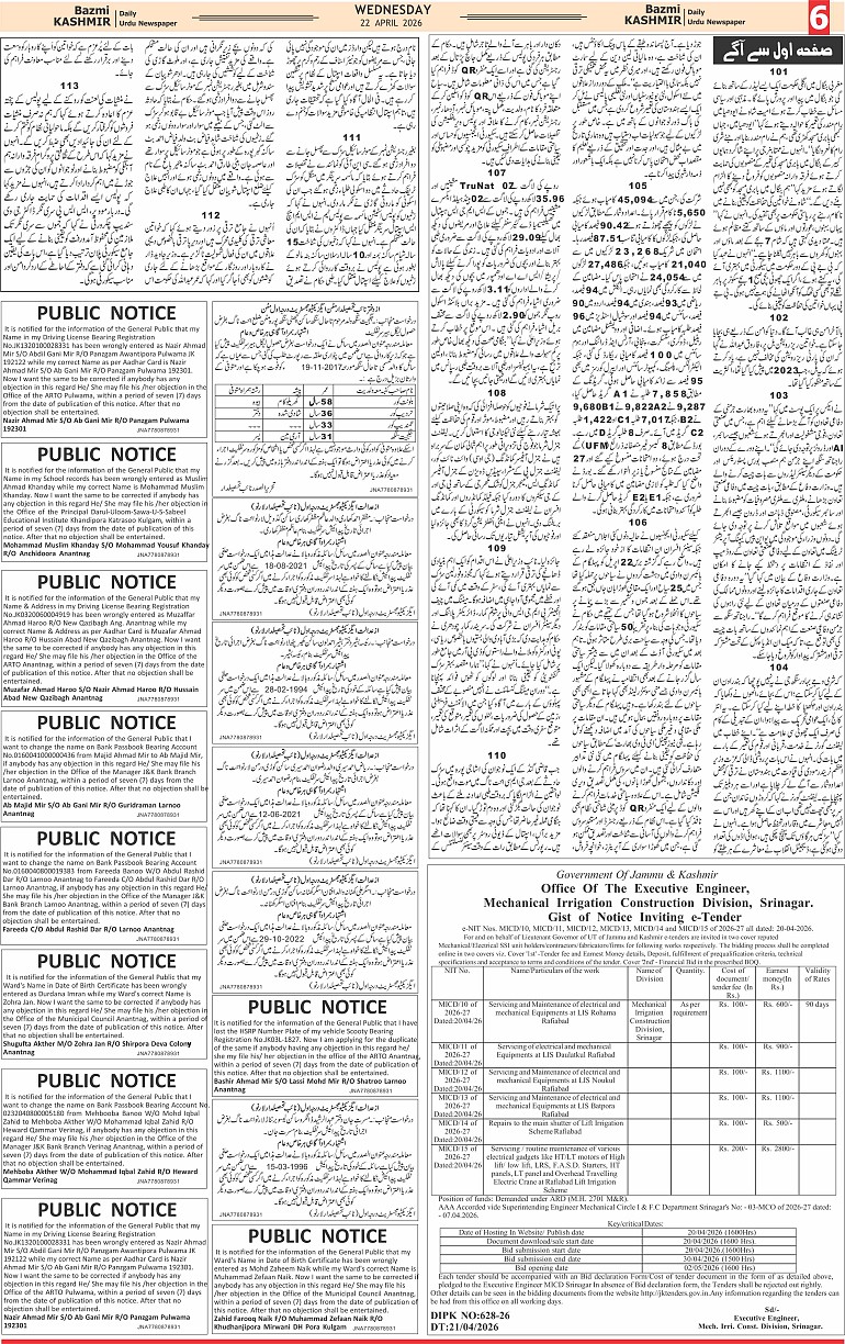 Bazam Kashmir Page: 6 April 22, 2026 << First << 6 >> Last >> Page 1Page 2Page 3Page 4Page 5Page 6Page 7Page 8 × Bazam Kashmir B -6 B -1B -2B -3B -4B -5B -6B -7B -8